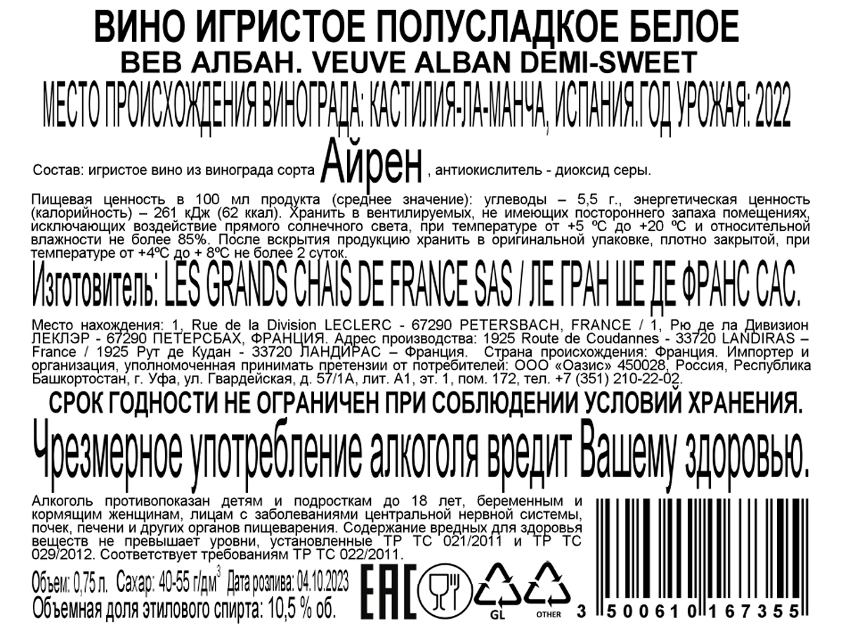 Вино игристое ВёВ Албан белое полусладкое