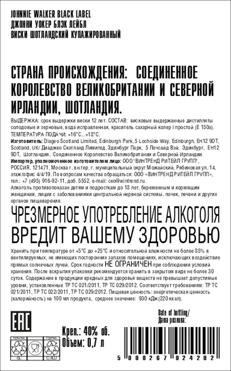 Виски Джонни Уокер Блэк Лейбл 12 лет 0,7 л