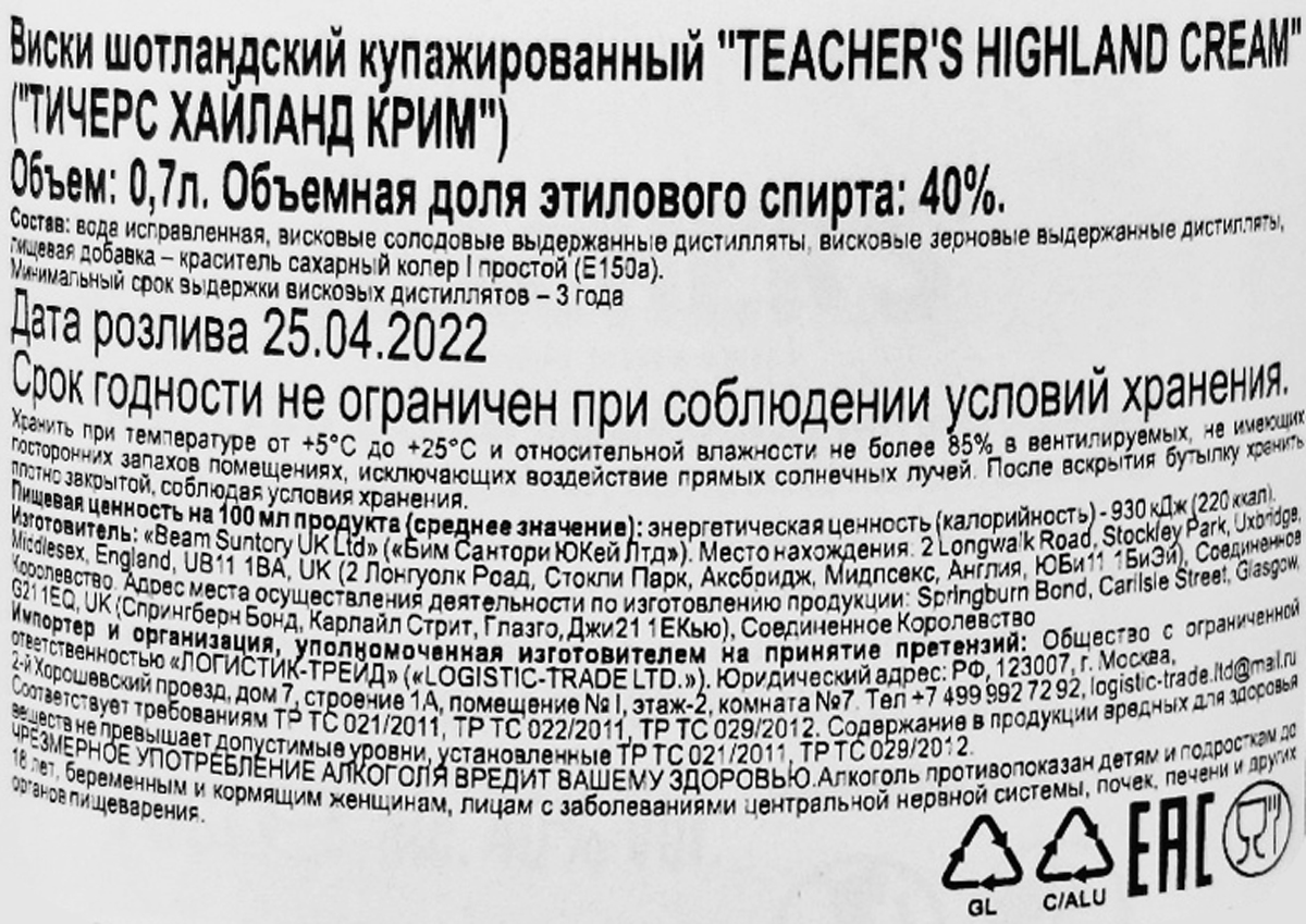 Виски Тичерс Хайланд Крим не менее 3 лет 0,7 л
