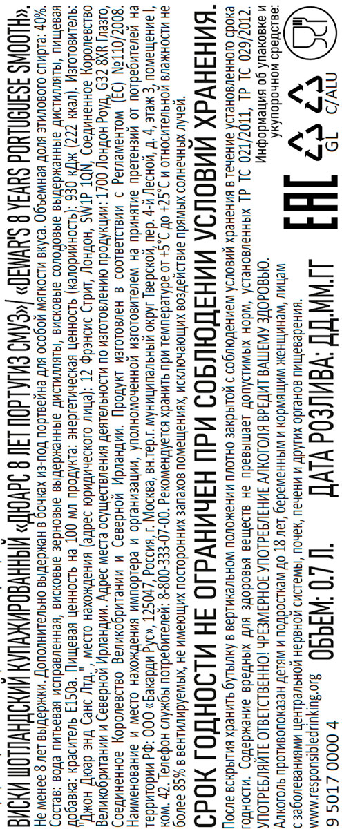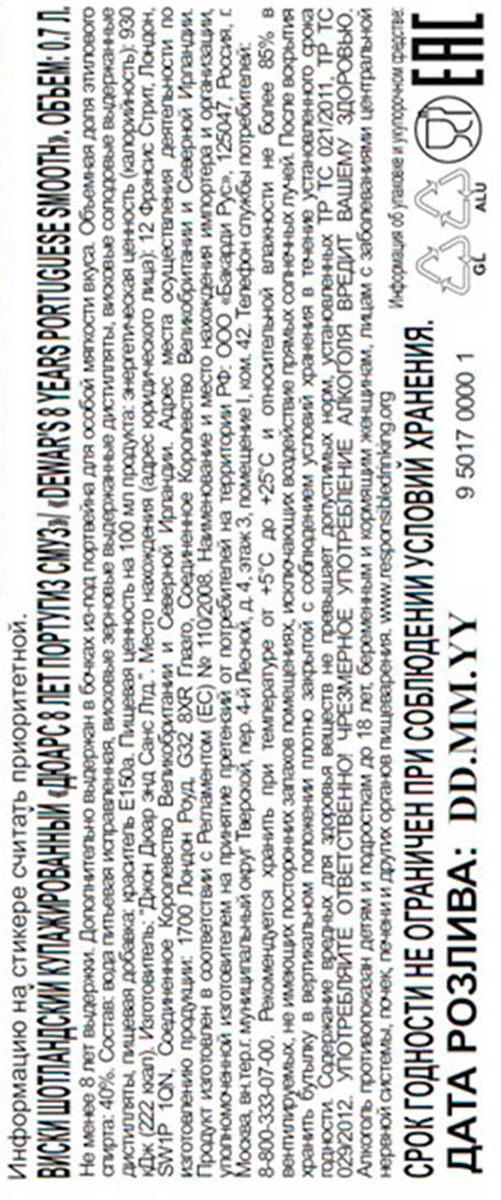 Виски Дюарс Португиз Смуз купажированный 8 лет 0,7 л