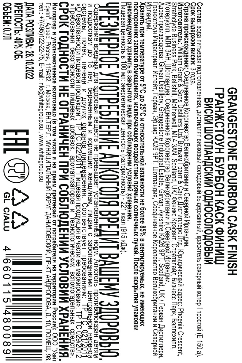 Виски Гранжстоун бурбон каск финиш п/к 0,7 л