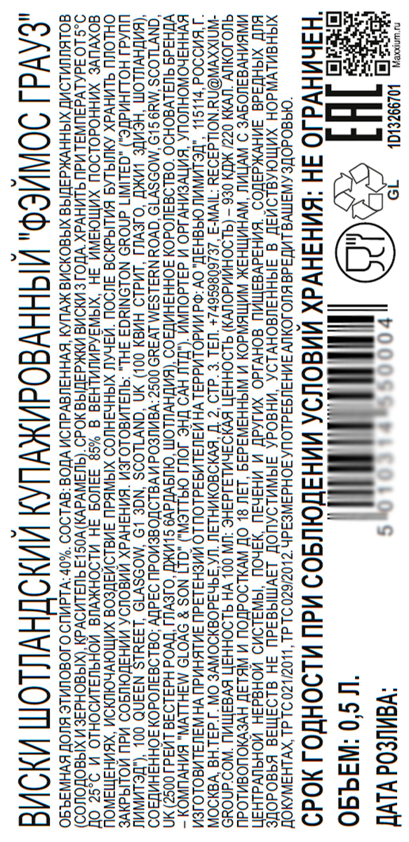 Виски глубокого золотистого цвета со сбалансированным ароматом с нотками хереса, печёных фруктов и какао. Отличается богатым вкусом с тонами сухофруктов и мягким послевкусием. Пристальное внимание на протяжении многих десятилетий к исходному сырью, а также ко всем процессам производства и выдержки сделали The Famous Grouse самым продаваемым купажированным виски в Шотландии.