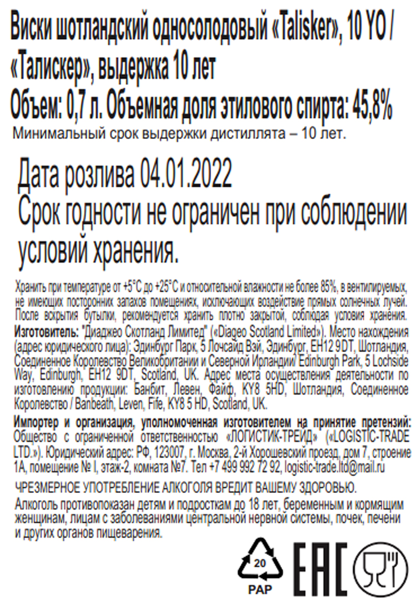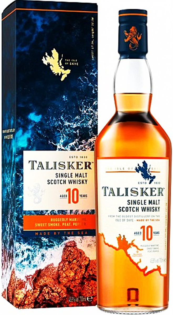 Односолодовый шотландский виски Talisker 10 Years Old производится на старейшей дистиллерии острова Скай. Виски искрящегося золотого цвета. Обладает полным, богатым, насыщенным, теплым вкусом, в котором ощутимы сладкие ноты сухофруктов, ячменно-солодовые тона и оттенки дыма. Продолжительное, насыщенное послевкусие демонстрирует торфяные, перечные и солоноватые морские ноты. Насыщенный аромат наполнен тонами дыма и торфа. В нем также уловимы нотки сока свежих устриц, морской соли и сладкие цитрусовые оттенки. Виски употребляется в чистом виде, а также наилучшим образом сочетается с блюдами, имеющими ярко выраженный вкус (жирной жареной рыбой, зрелым сыром «Конте» и другими). Используется для приготовления изысканных коктейлей.