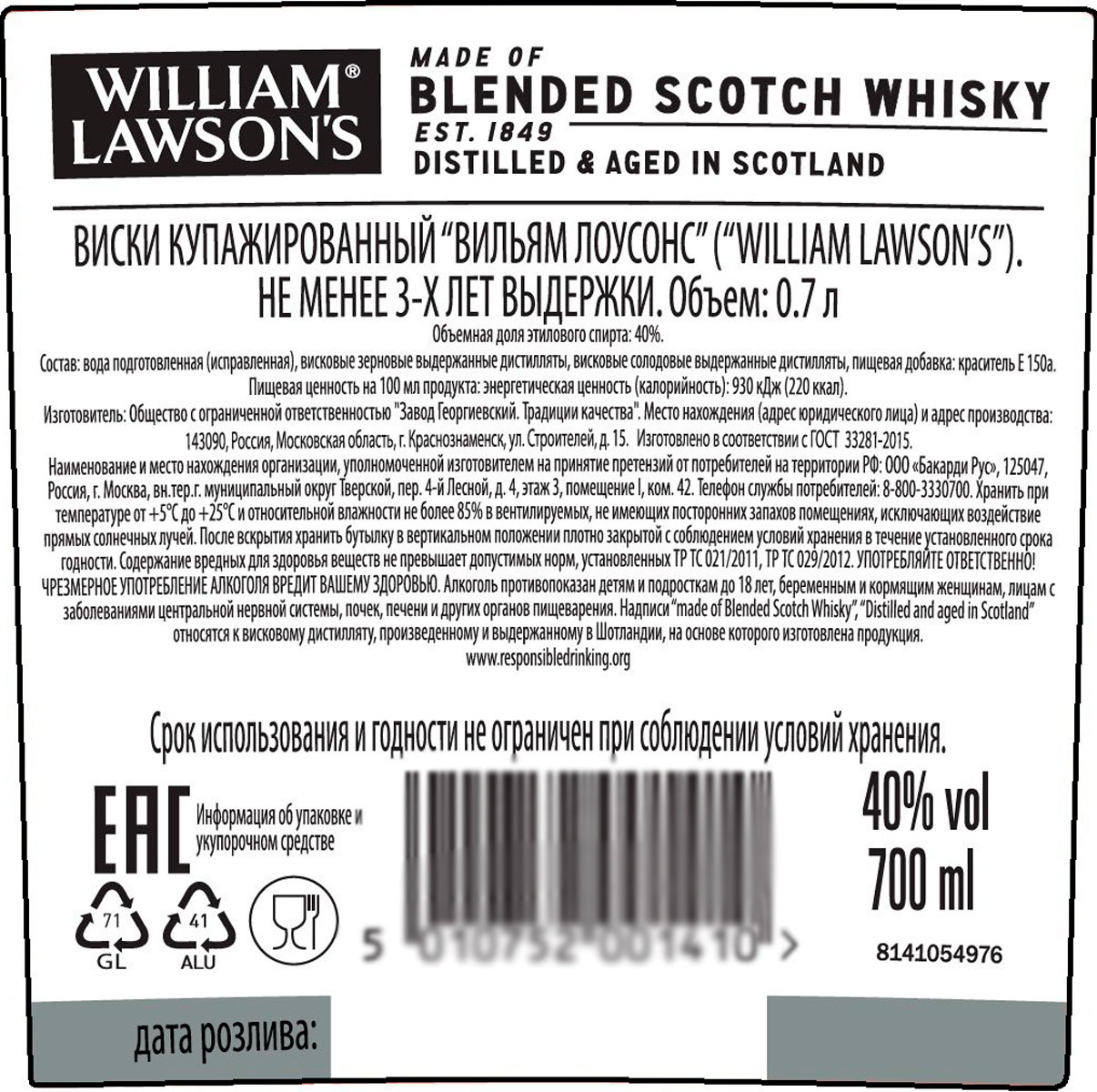 Виски Вильям Лоусонс купажированный не менее 3 лет 0,7 л
