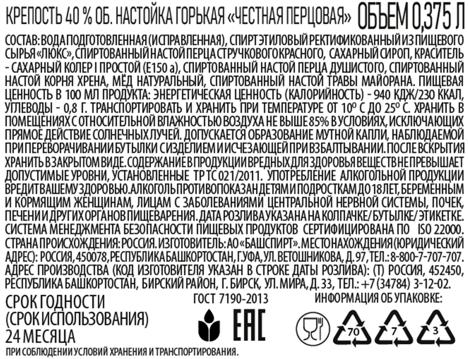 Настойка горькая Честная перцовая 0,375