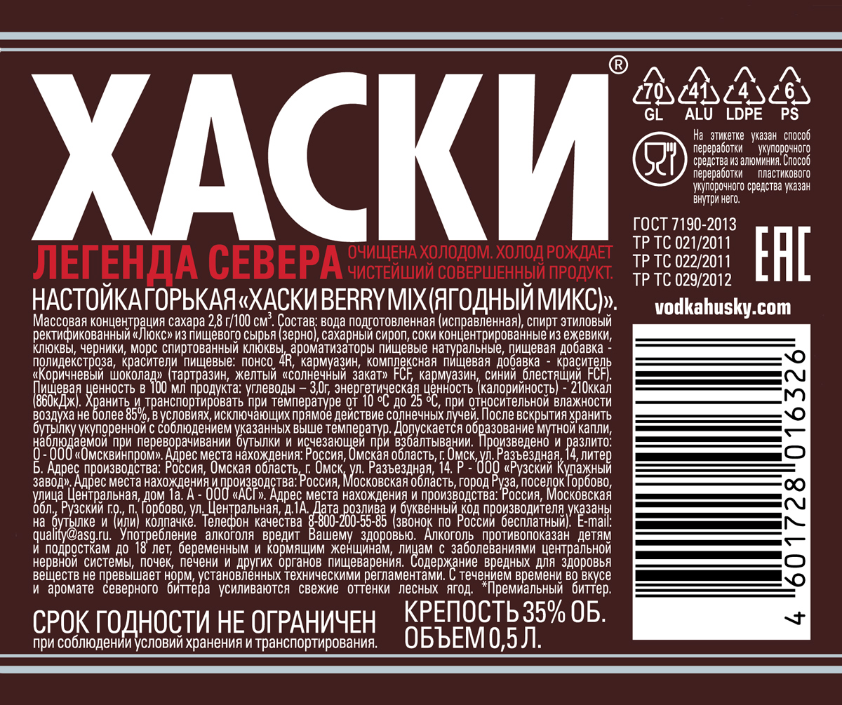 Харизматичный крепкий биттер «Хаски BerryMix» на основе натуральных морсов северных ягод. Микс клюквы, ежевики, черники позволяет получить яркий вкус и ягодную мягкость. При производстве бренда «Хаски» используется технология «обработки холодом»: чем ниже температура при очистке, тем выше количество поглощенных фильтром примесей. В результате такой фильтрации продукция бренда «Хаски» очищается наиболее качественно. Холод рождает сверхчистый совершенный продукт
