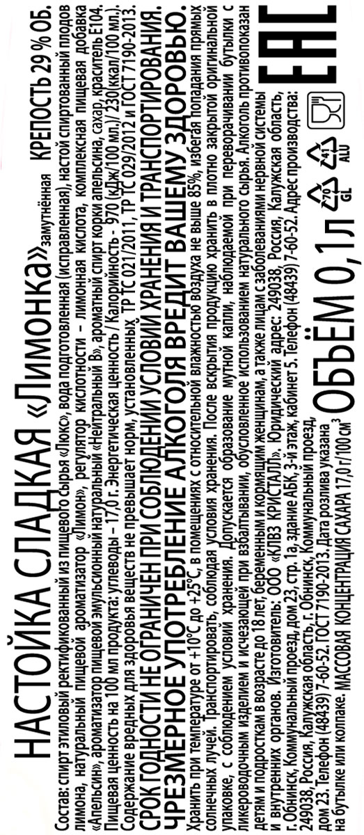 Настойка Лимонка сладкая 0,1 л