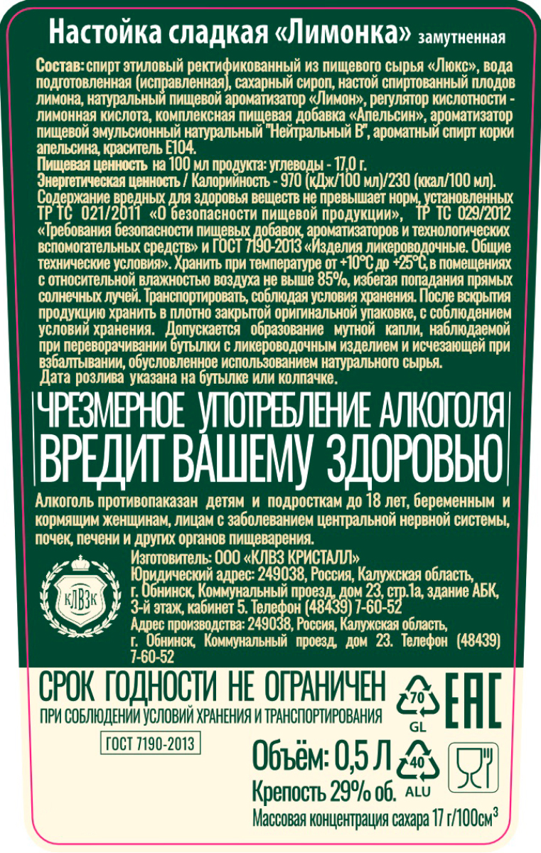 Настойка Лимонка сладкая 0,5 л