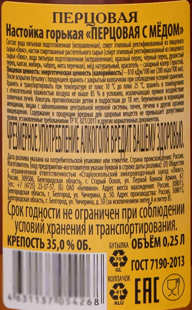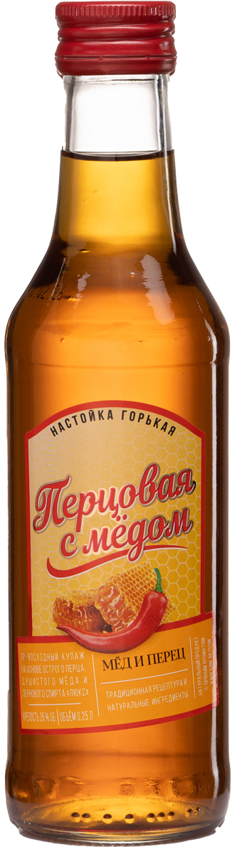 Настойка горькая «Перцовая с медом» изготовлена из ректификованного этилового спирта класса «Люкс», мягкой воды, прошедшей трехступенчатый процесс очистки: угольный, катионный и механический, а также спиртованного настоя нескольких видов жгучего перца и натурального меда и корня имбиря. Благодаря классическому методу производства все полезные свойства сохраняются, а вкус приобретает удивительную мягкость. Рекомендуется подавать в чистом виде, а также с блюдами традиционной русской кухни.