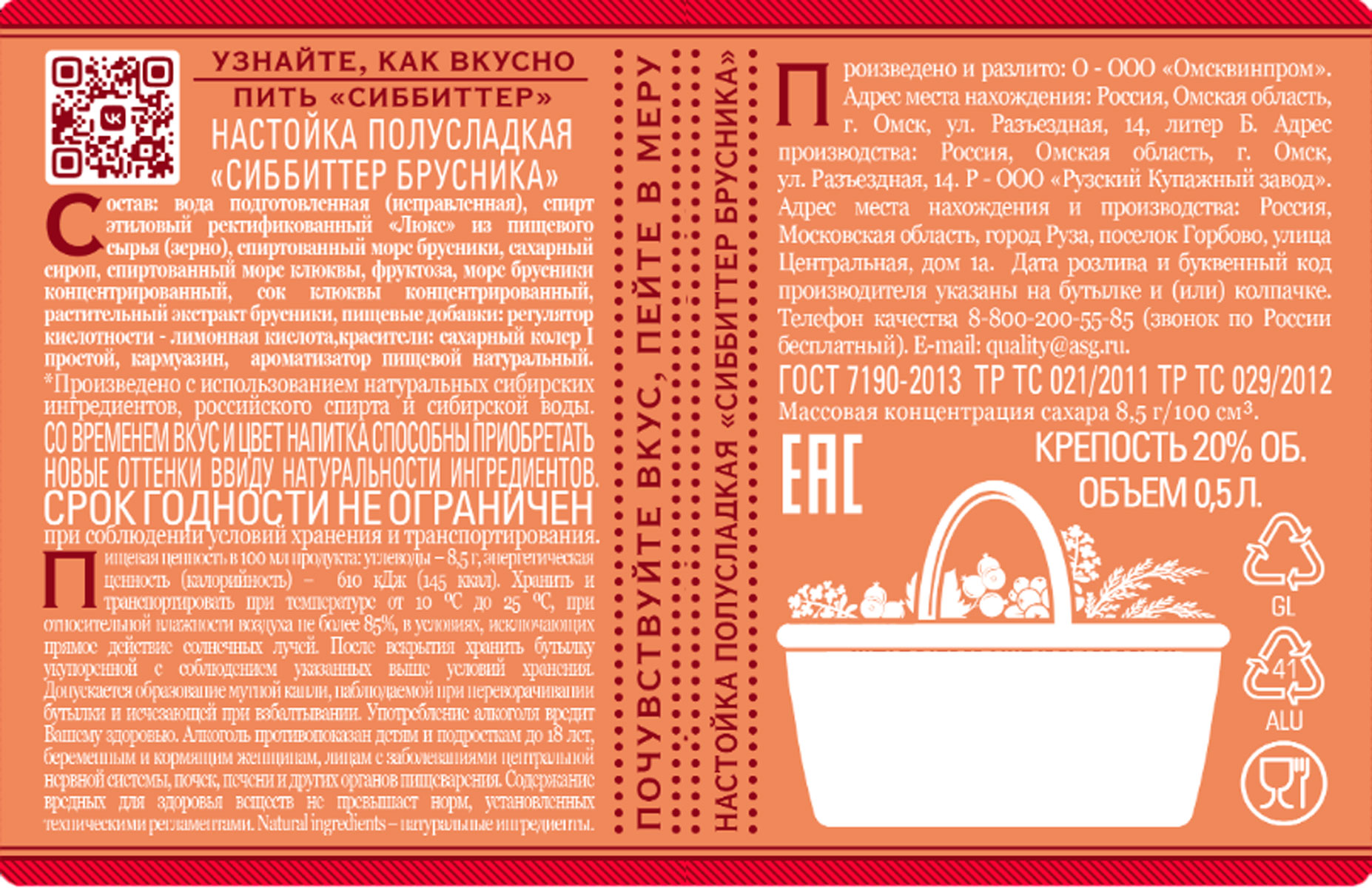 Настойка Сиббиттер Брусника полусладкая 0,5 л