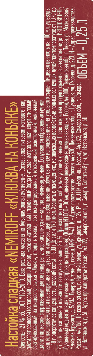 Настойка сладкая Немирофф клюква на коньяке