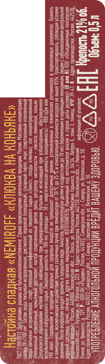 Настойка сладкая Немирофф клюква на коньяке 0,5 л