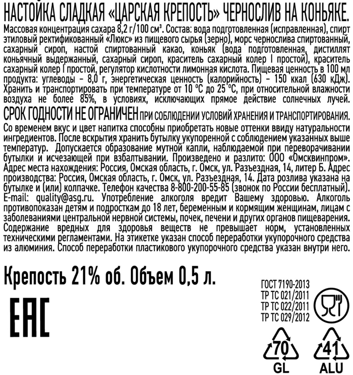 Настойка «Царская крепость. Чернослив на коньяке» изготавливается на заводе «Омсквинпром» исключительно из натуральных компонентов – плодово-ягодных морсов и настоящего коньяка трёхлетней выдержки. Сладкая, ароматная настойка с ярко выраженным вкусом чернослива и насыщенным янтарным цветом. Настойка изготавливается на основе натурального морса из чернослива, с добавлением настоя какао, что создает тонкий и неповторимый вкус, который, несомненно, запомнится и подарит отличное настроение. Употреблять эту настойку лучше всего в чистом виде.