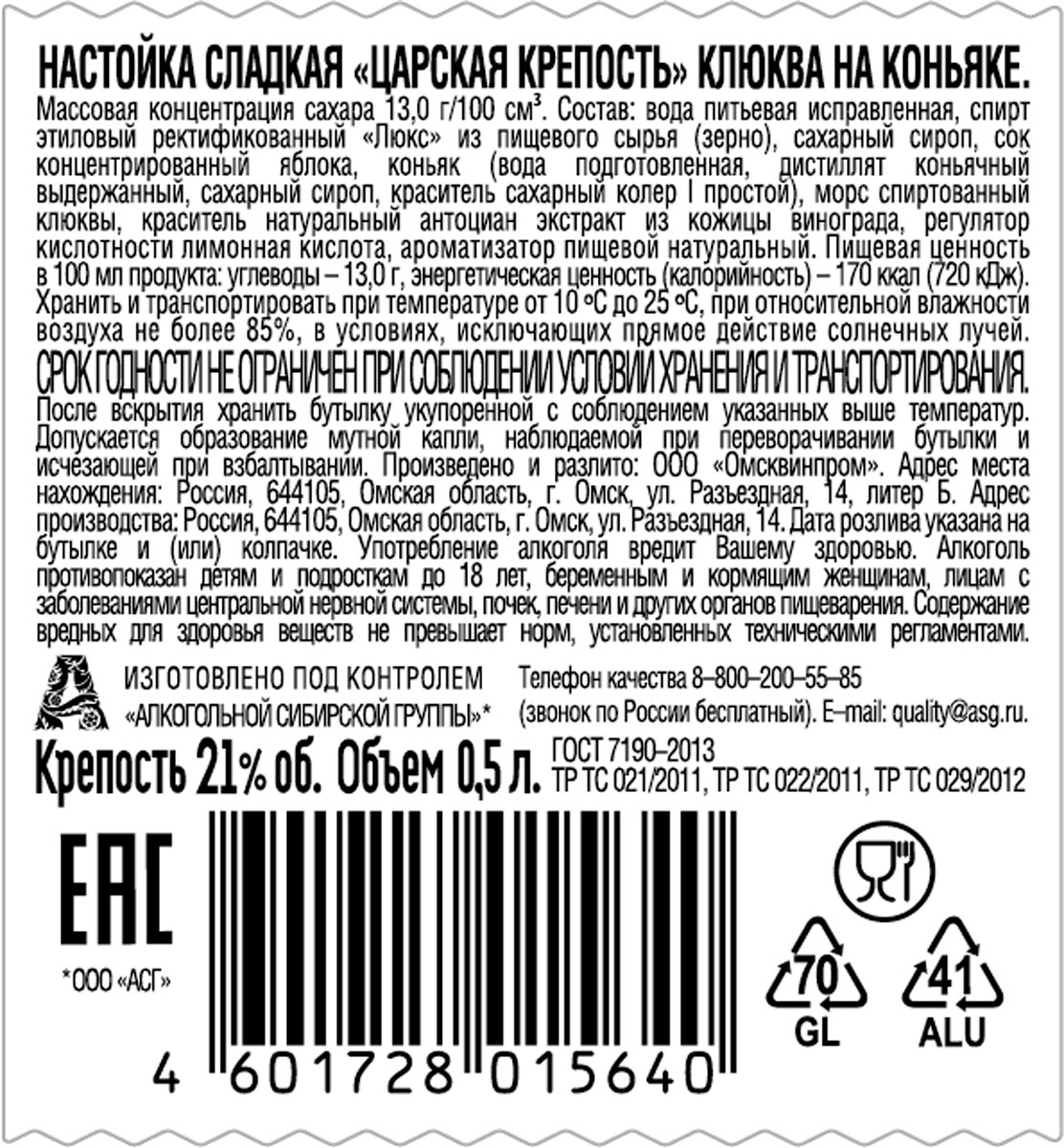 Настойка «Царская крепость. Клюква на коньяке» изготавливается на заводе «Омсквинпром» исключительно из натуральных компонентов – плодово-ягодных морсов и настоящего коньяка трёхлетней выдержки. В этом напитке нотки коньяка прекрасно сочетаются с оригинальной кислинкой клюквы – традиционной сибирской ягоды. Этот напиток удачно сочетается с любыми блюдами, поэтому получил особое распространение.