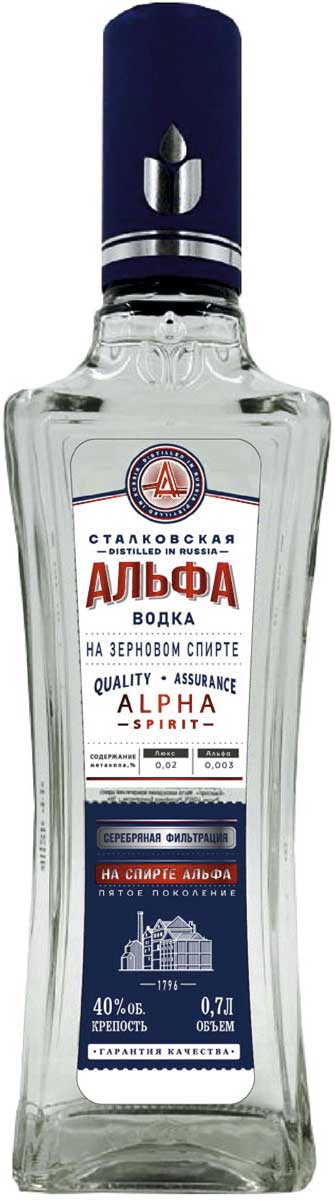Водка «Сталковская Альфа» изготовлена из высококачественного спирта нового поколения «Альфа», на основе чистейшей, прошедшей многоступенчатую очистку воды, с сочетанием сырья и высочайшего качества и современных технологий производства, включающих серебряную фильтрацию, придающей напитку кристально чистый вкус. Спирт последнего поколения «Альфа», принципиально отличается от существующих спиртов ужесточенными требованиями к содержанию метилового спирта (не более 0,003%).