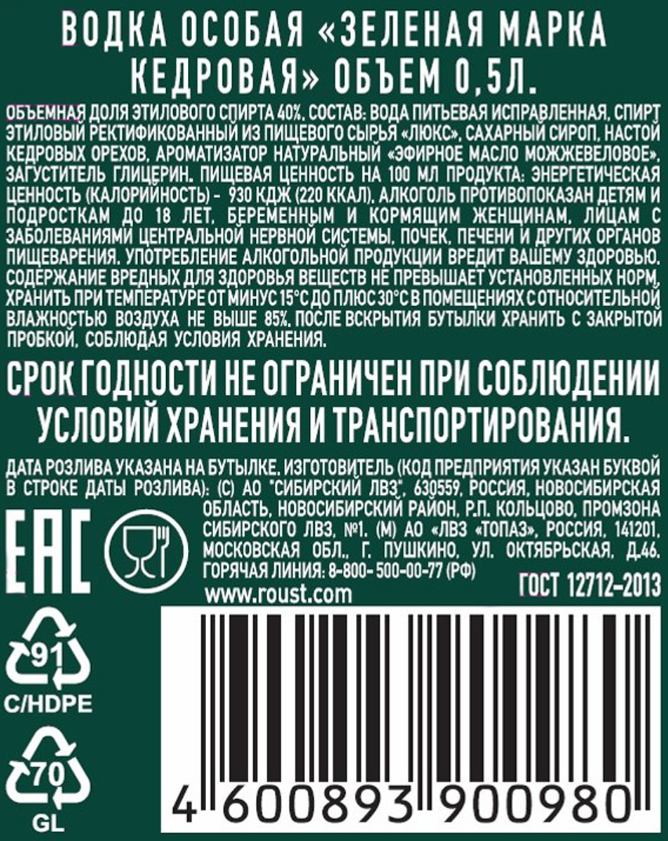 Водка особая Зеленая Марка Кедровая 0,5 л