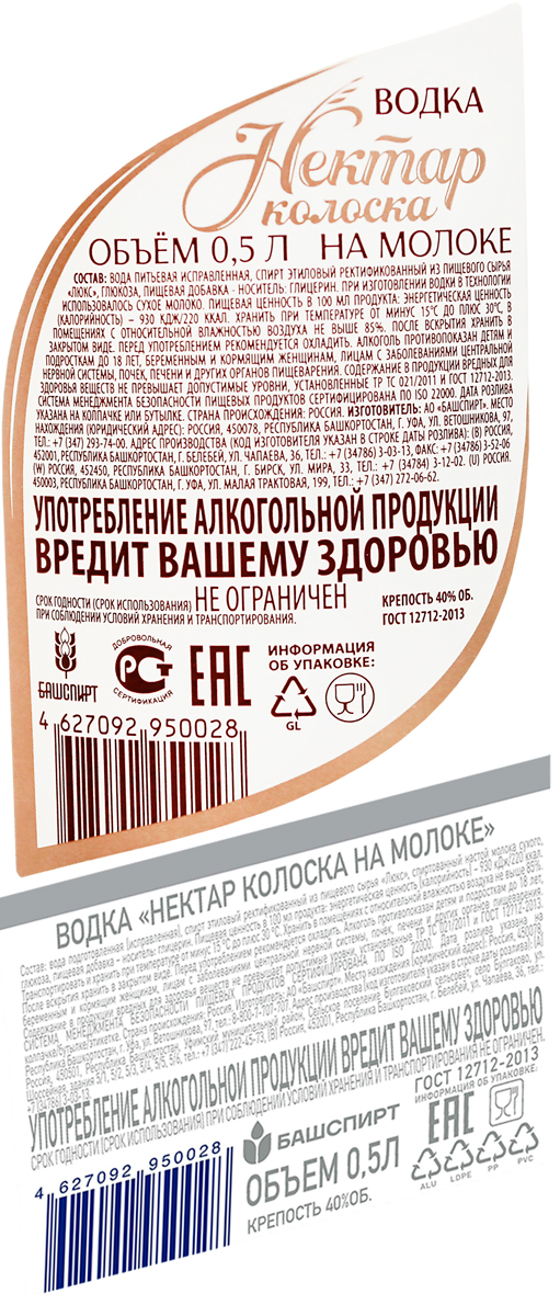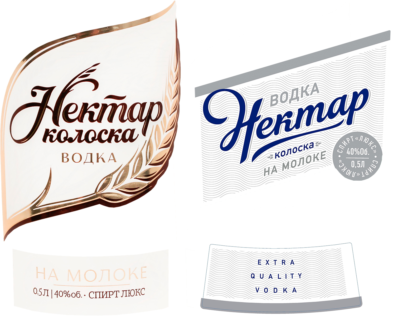 Приятные вкусовые оттенки водок серии «Нектар колоска» формируются оригинальными вкусовыми добавками в их составе. Это спиртовой настой пшеницы, настой миндаля. «Нектар колоска на молоке» — классическая пшеничная водка, очищенная молоком, поражает удивительно мягким вкусом. Изготовлена на спирте «Люкс». Легко пьется, что создает приятную, дружескую атмосферу за столом.