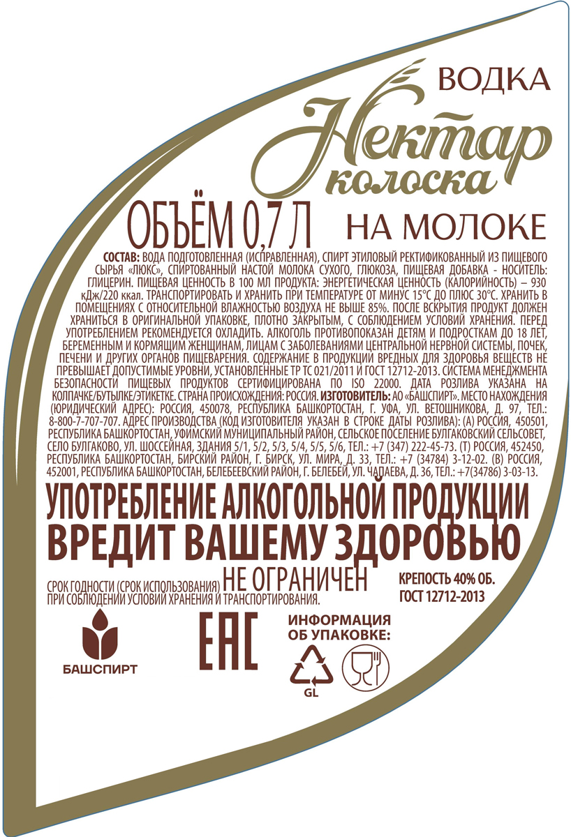 Водка Нектар Колоска на Молоке