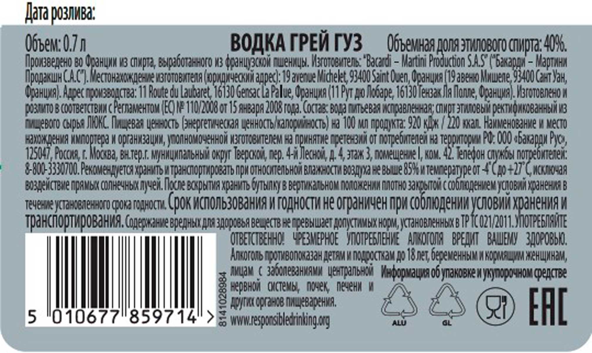 Grey Goose – французская водка премиум-класса, созданная для американского рынка в 1997 году. Она изготавливается из богатой кальцием родниковой воды и озимой пшеницы, выращиваемой в Пикардии (Франция). Водка является безглютеновой: клейковина удаляется в процессе производства на этапе 5-кратной дистилляции и последующей фильтрации. Уникальная французская водка Grey Goose производится в округе Коньяк. Её вкус чистый и округлый, а маслянистая, сочная текстура оставляет приятное послевкусие. Водка имеет ясный и свежий аромат с элегантным цветочным флером и тонкими цитрусовыми нотками.