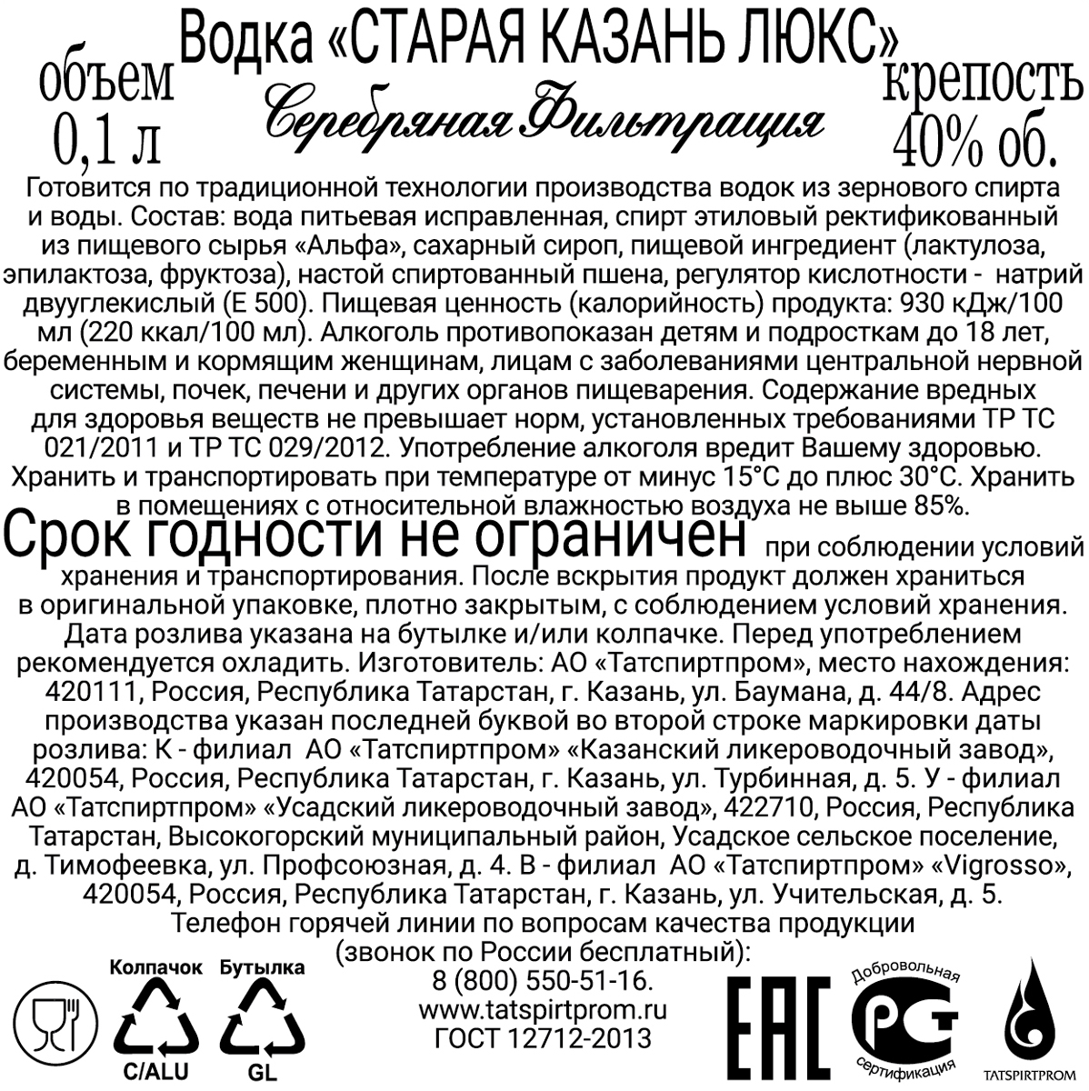 Водка «Старая Казань» готовится по классической технологии производства водок из зернового спирта и воды. Серебряная фильтрация дарит этому напитку приятный, слегка сладковатый вкус. Эта водка прекрасно подойдет к блюдам русской, татарской и европейской кухонь, также ее можно использовать для приготовления коктейлей.