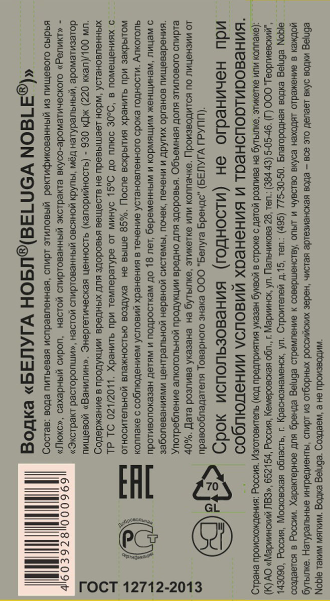 Благородная водка Beluga Noble создается в самом сердце Сибири. Характерное для бренда Beluga стремление к совершенству, опыт и чувство вкуса находят отражение в каждой бутылке. Натуральные ингредиенты, солодовый спирт из отборных российских зерен, чистая артезианская вода из Сибири – все это делает вкус водки Beluga Noble таким мягким. Водка Beluga — создаем, а не производим!