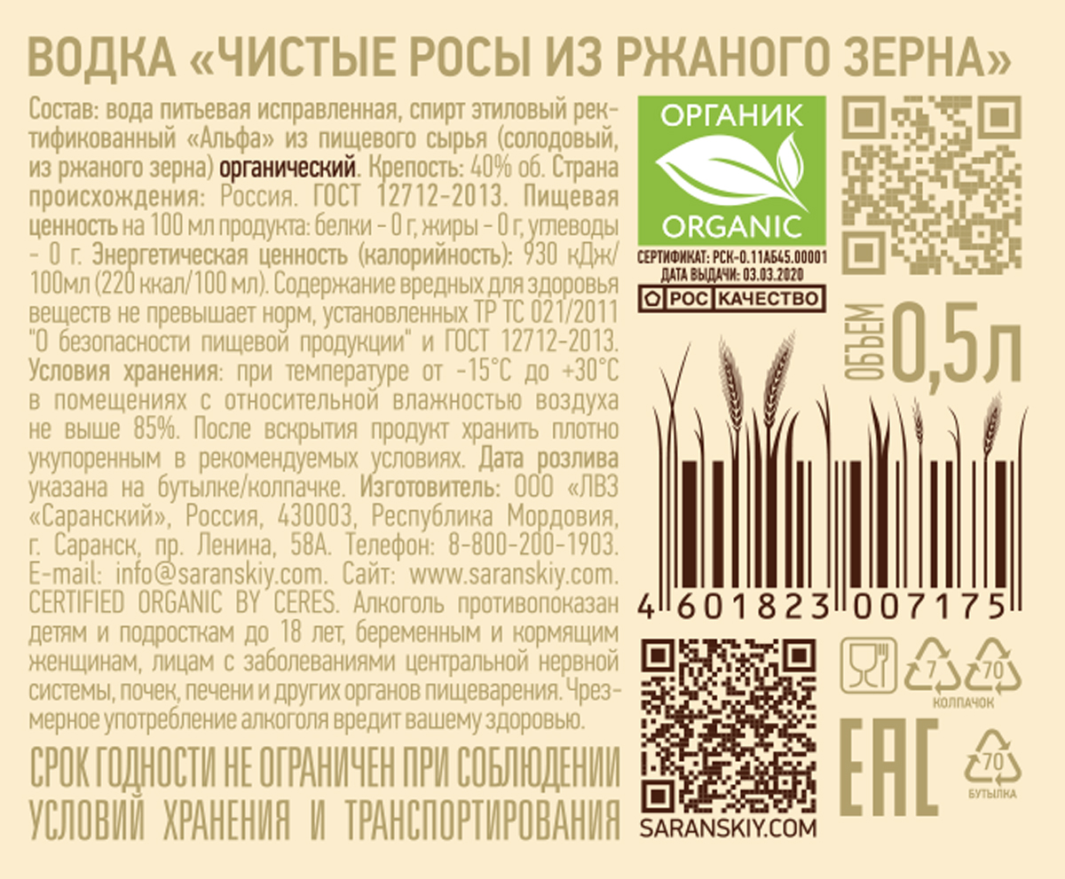 «Чистые Росы» – первая органик-водка России, все этапы создания которой сертифицированы по органик-стандартам России, США и Евросоюза. Органическая рожь для производства 100% органик-спирта выращена на сертифицированных полях экохозяйства «Биосфера» в Республике Мордовия. Его почвы не подвергались воздействию неорганических удобрений с 2002 года. Объём зерна для изготовления органик-спирта ограничен урожайностью года и площадью поля, именно поэтому органик-водка «Чистые Росы» выпускается ограниченными партиями, и каждая бутылка получает свой индивидуальный номер.