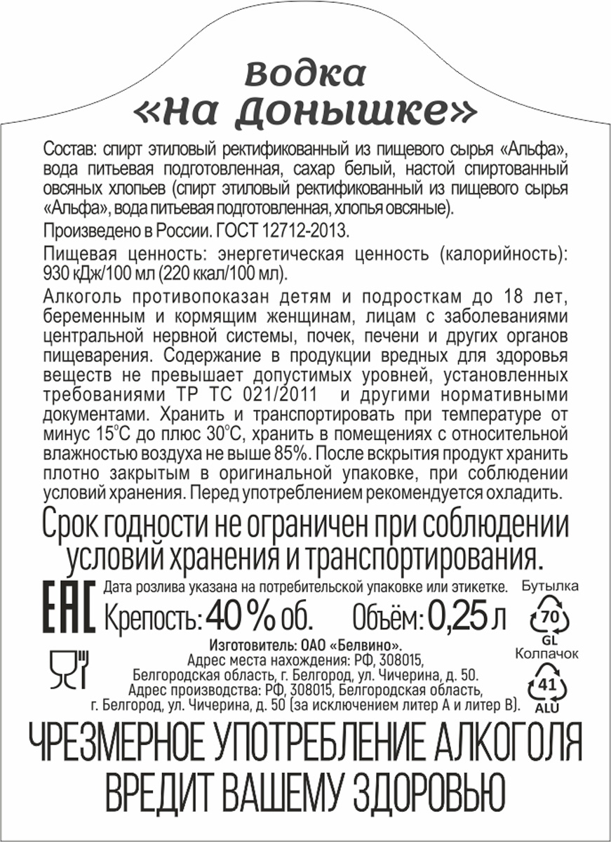 Особую мягкость водке «На Донышке» придает настой овсяных хлопьев. Обладает выразительным гармоничным вкусом и приятным послевкусием. При приготовлении водки используется чистая природная артезианская вода.
