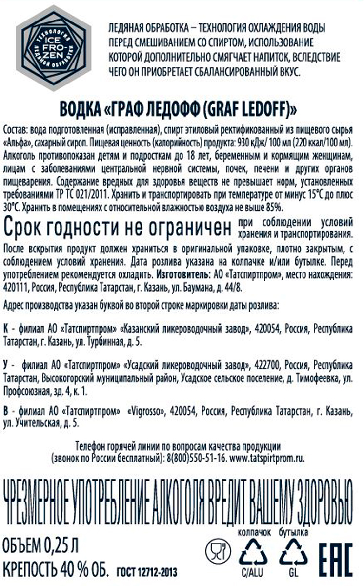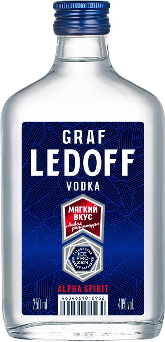 Водка GRAF LEDOFF — это первая водка Казанского ликероводочного завода, приготовленная из спирта категории «Альфа». Особое внимание к этапам производства является основой для получения продукта высочайшего качества и чистоты. При производстве водки GRAF LEDOFF применяется уникальная технология подготовки воды — «ледяная обработка». Охлаждение воды перед смешиванием со спиртом препятствует образованию вредных примесей, вследствие чего напиток приобретает кристальную чистоту и получает особый мягкий вкус.