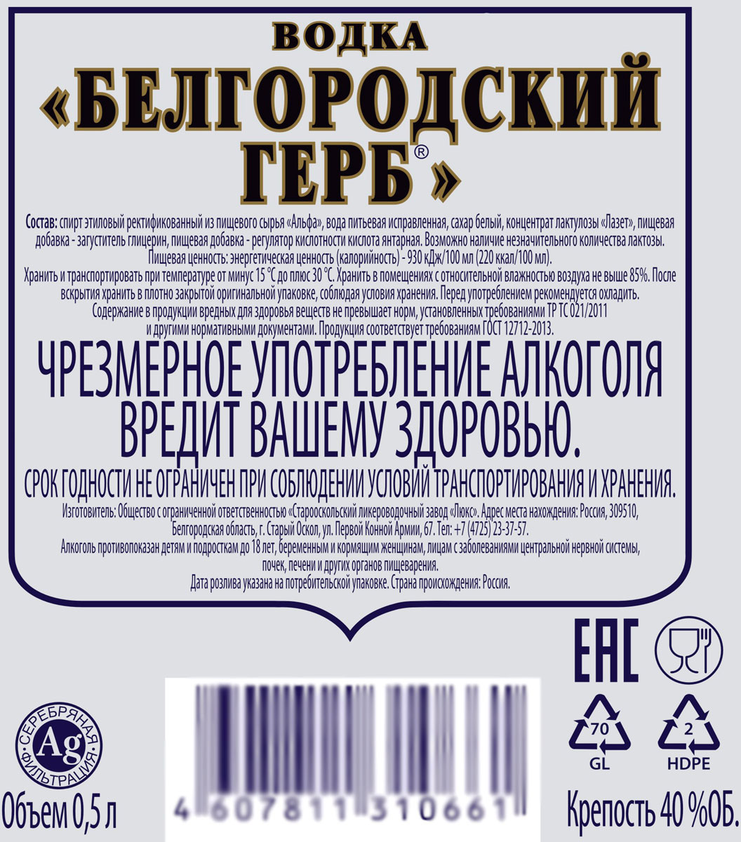 Водка изготовлена на основе исправленной питьевой воды с добавлением ароматного спирта. Уникальность рецептуры заключается в тройной фильтрации: угольной, серебряной и платиновой. Водка «Белгородский герб» выпускается в премиальной бутылке с вогнутым дном и колпачком «гуала» с дозатором.