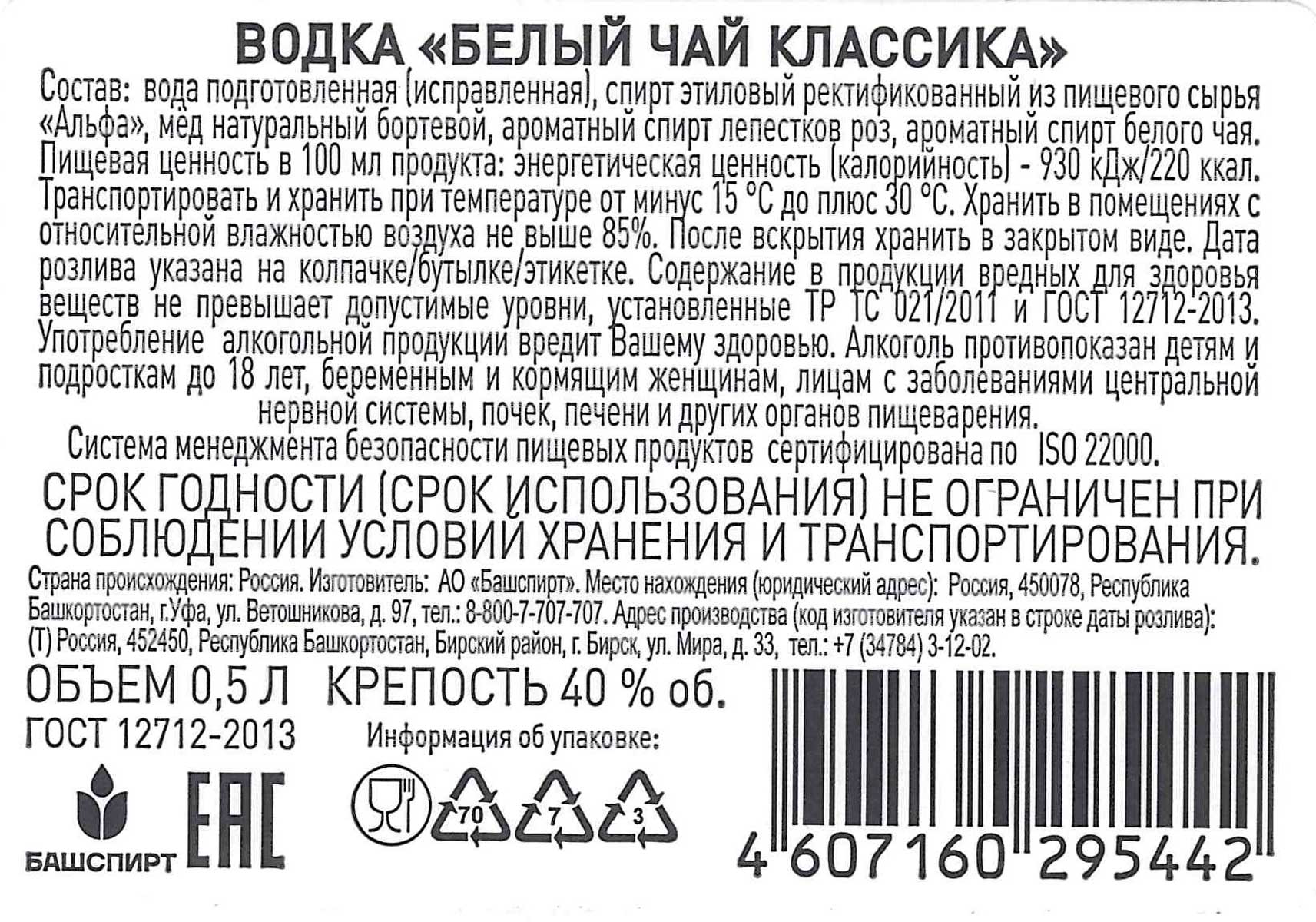 Водка «Белый чай» передаёт чудесные свойства китайского белого чая сорта «Белые иглы», известные всему миру. Его собирают всего несколько дней в году, в утренние часы, срывая два-три верхних листочка. Продукт изготавливается на спирте «Альфа» с добавлением настоя белого чая и бортевого меда. Имеет оригинальный изысканный вкус.
