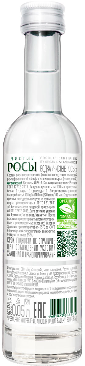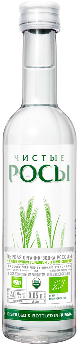 «Чистые Росы» — первая органик-водка России. Органическая пшеница выращена в естественных условиях на полях эко-хозяйства «Биосфера» (Республика Мордовия), почвы которого прошли органик-сертификацию и не подвергались воздействию удобрений в течение 18 лет. Особый контроль продукции обеспечивается ручным производством. Каждая бутылка получает свой индивидуальный номер.