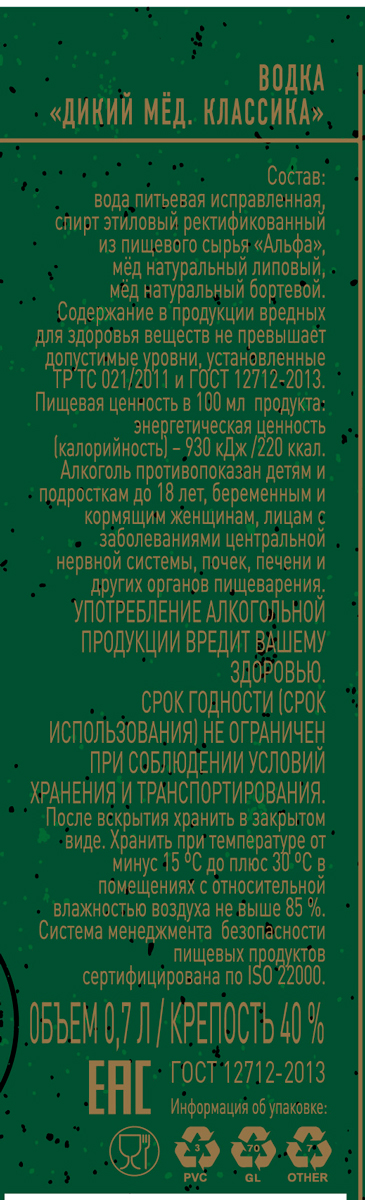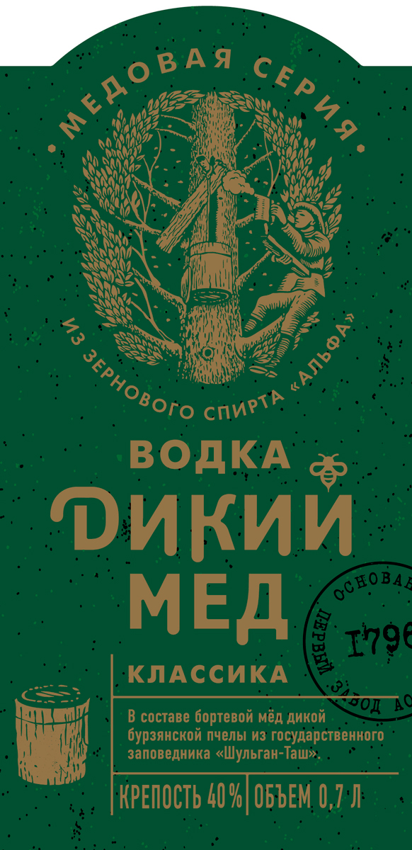 Водка "Дикий мед классика" изготовлена по оригинальной рецептуре, соблюдая старинные русские традиции, на основе высококачественного спирта "Альфа" из отборного зерна и специально подготовленной очищенной воды.