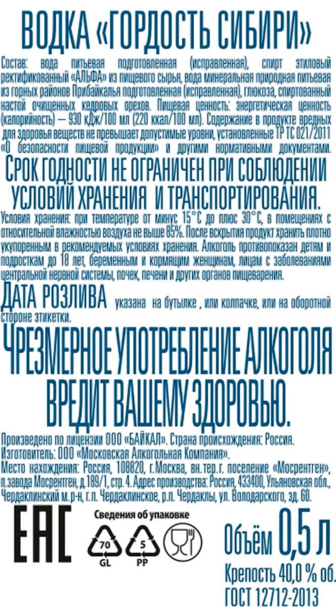 «Гордость Сибири» — классическая водка с удивительно мягким и свежим вкусом, достойная называться гордостью Сибири. Для изготовления водки используют талую минеральную воду, которая добывается в горных районах Прибайкалья, и зерновой спирт высочайшей категории «Альфа». Особые ингредиенты, такие как ароматный спирт клюквенного морса и спиртованный настой очищенных кедровых орехов, формируют у напитка тот самый сибирский дух. Природно очищенная холодом «Гордость Сибири» — настоящая водка Прибайкалья!