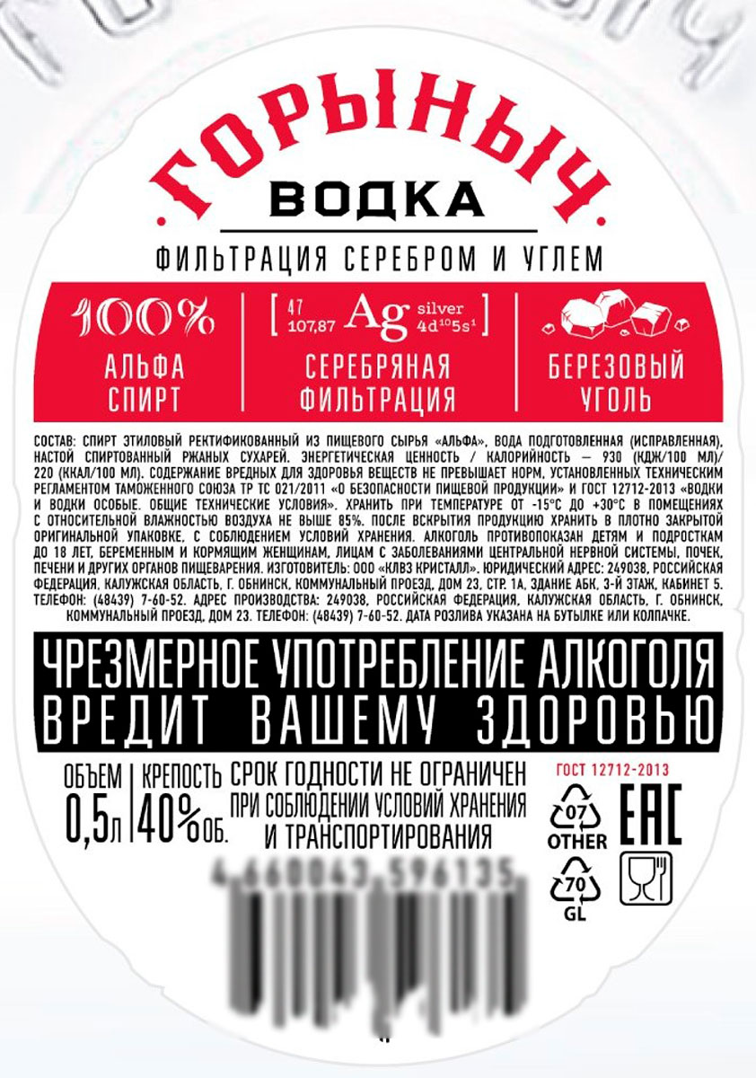 Водка Горыныч фильтрация серебром и углем 0,5 л