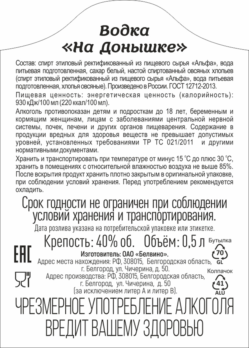 Особую мягкость водке «На Донышке» придает настой овсяных хлопьев. Обладает выразительным гармоничным вкусом и приятным послевкусием. При приготовлении водки используется чистая природная артезианская вода.