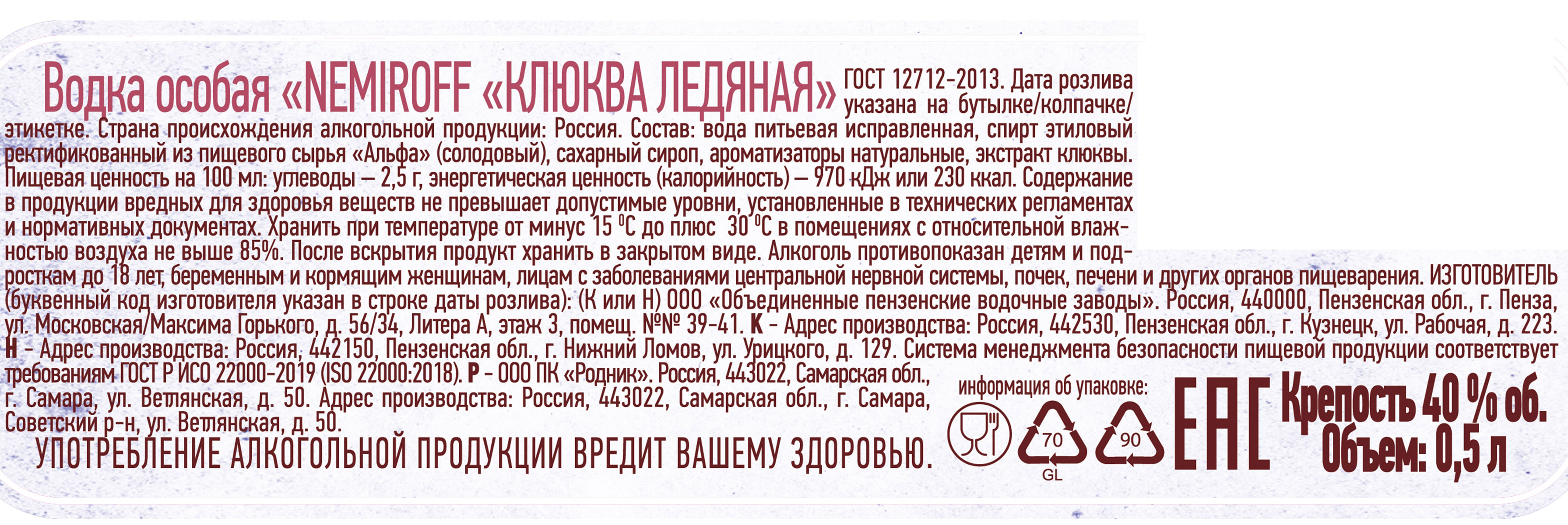 Водка особая Немирофф Клюква ледяная
