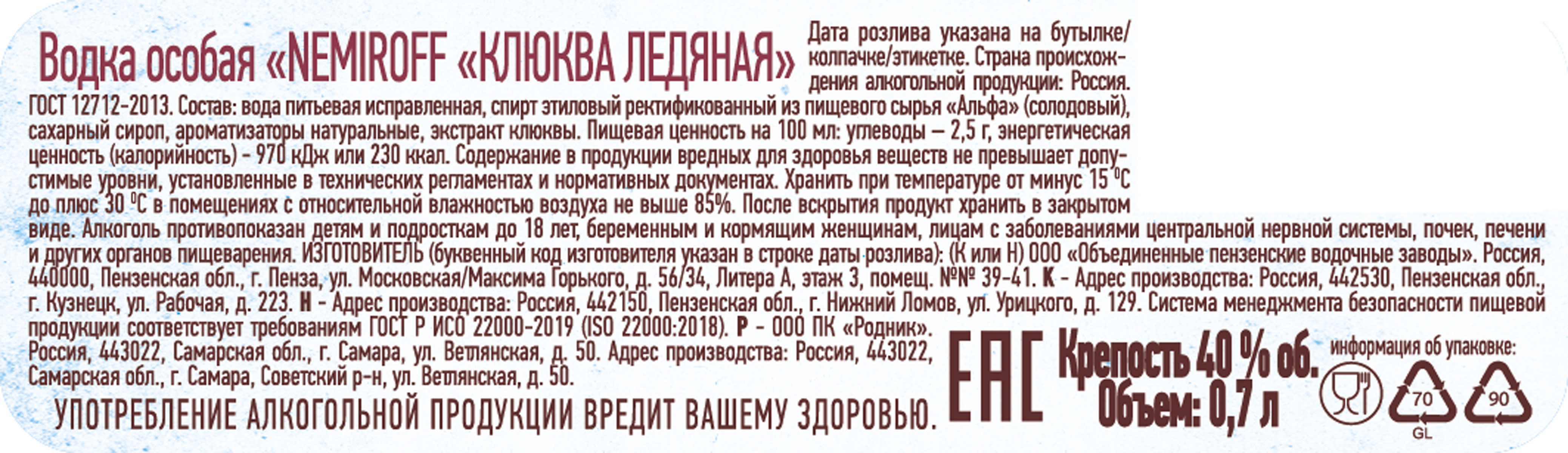 Водка особая Немирофф Клюква ледяная 0,7 л