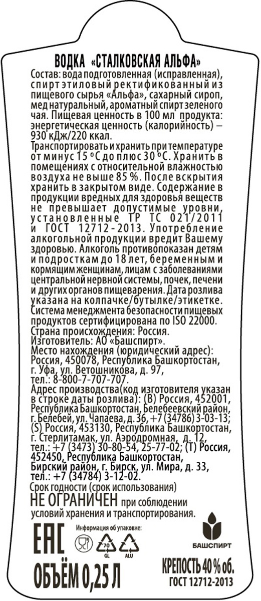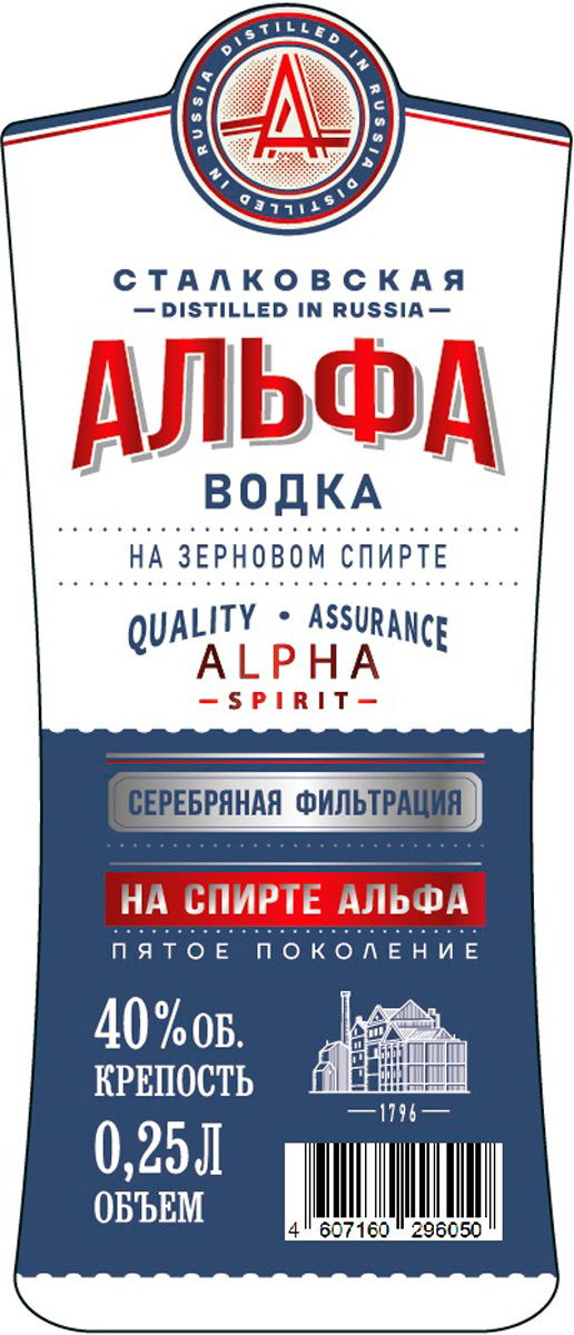 Водка «Сталковская Альфа» изготовлена из высококачественного спирта нового поколения «Альфа», на основе чистейшей, прошедшей многоступенчатую очистку воды, с сочетанием сырья высочайшего качества и современных технологий производства, включающих серебряную фильтрацию, придающей напитку кристально чистый вкус. Спирт последнего поколения «Альфа» принципиально отличается от существующих спиртов ужесточенными требованиями к содержанию метилового спирта (не более 0,003%).