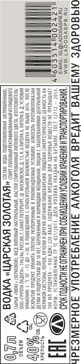 Водка «Царская Золотая» – напиток класса premium. Приготовлена по рецепту петровских времен: на липовом меду, с настоем липового цвета. При создании водки «Царская Золотая» используется спирт «Люкс» и чистая вода из Ладожского озера. Процесс очистки включает в себя прохождение продукта через систему специальных мембранных фильтров, прошитых золотой нитью. Бутылка водки «Царская Золотая» декорирована золотом высшей пробы (99,9%) и изготовлена из специального аптекарского стекла, что гарантирует первозданный вкус водки на протяжении всего срока хранения. Водка «Царская Золотая» прекрасно сочетается с солянкой по-царски, ухой из семги или форели, икрой, блюдами из мяса, блинами и расстегаями. В качестве закусок идеальны маринады и соленья.