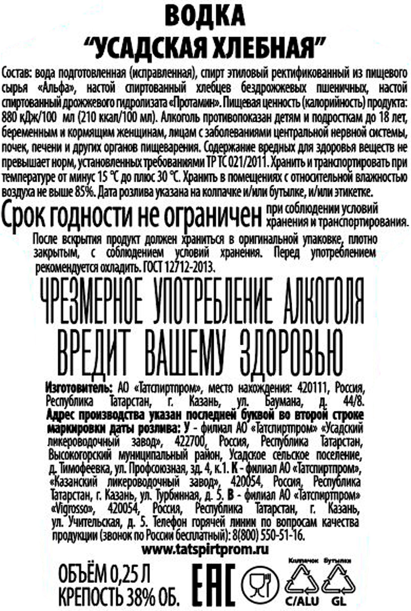 Водка Усадская хлебная