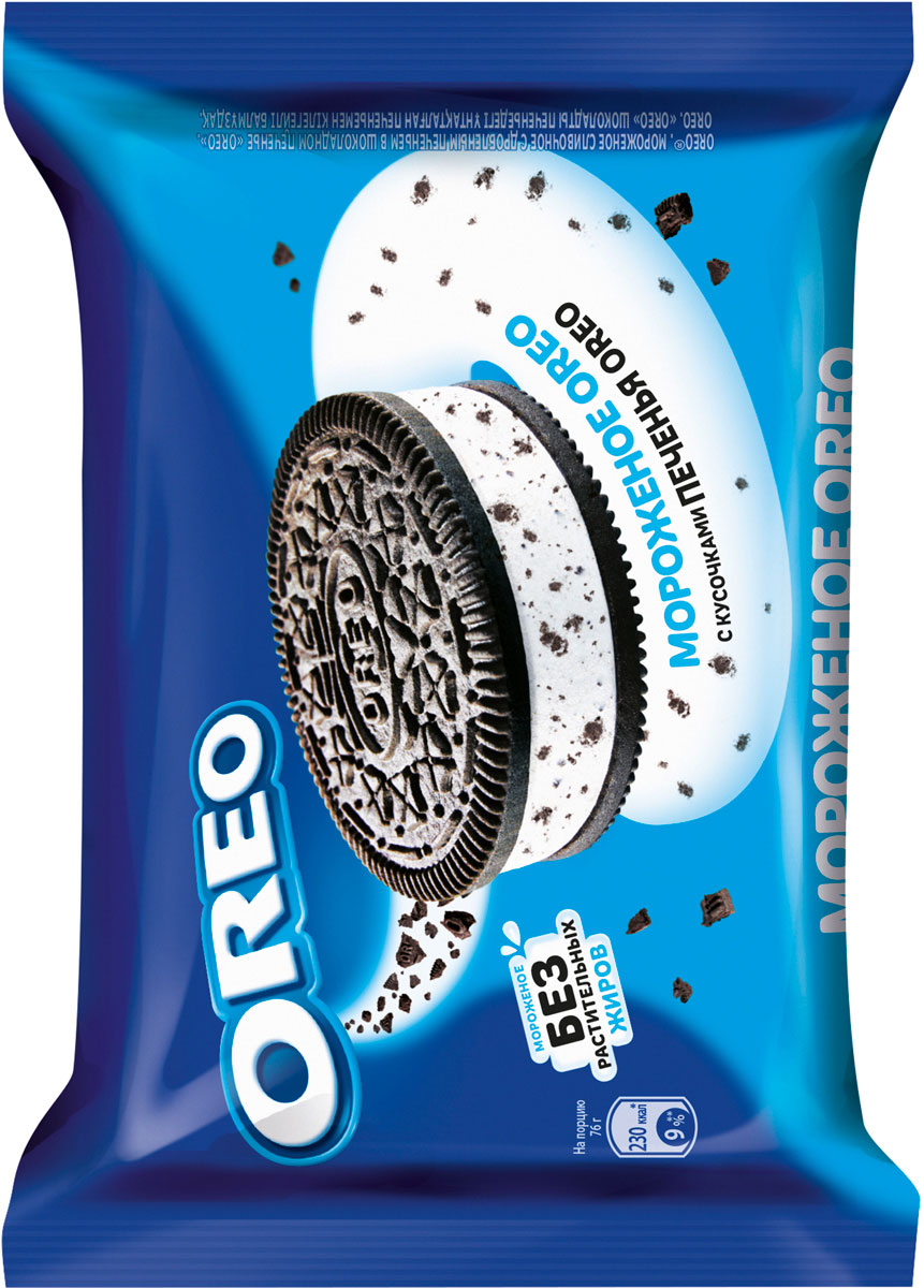 Сливочное ванильное мороженое без растительных жиров с кусочками культового печенья Oreo между двух гигантских печенек.