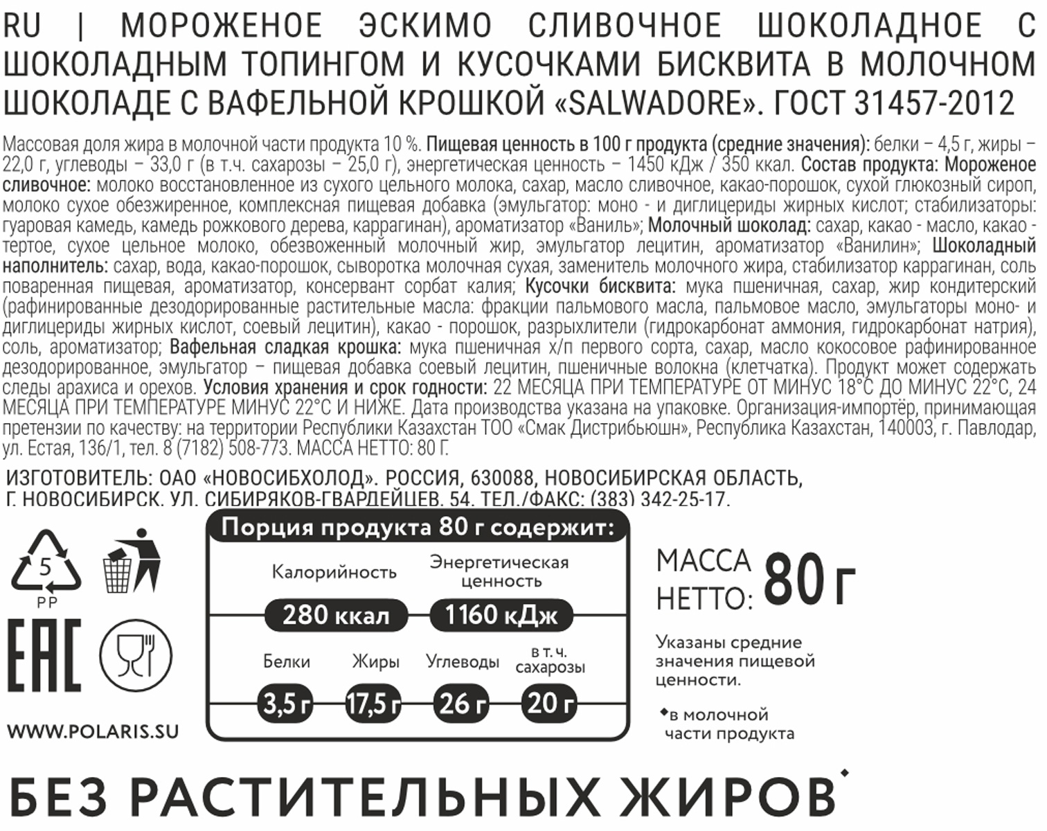 Эскимо Salwadore «4 шоколада» — насыщеный вкус для тех, кто любит много шоколада. Вас приятно удивит необычно раскрывающийся вкус сливочного шоколадного мороженого в сочетании с деликатным шоколадным топпингом, кусочками бисквитного шоколадного печенья, богатый вкус которого завершит нежный хруст вафельной крошки в молочном шоколаде. В эскимо Salwadore вы откроете для себя многоликость шоколада, собранную в одном мороженом. Себя нужно баловать!