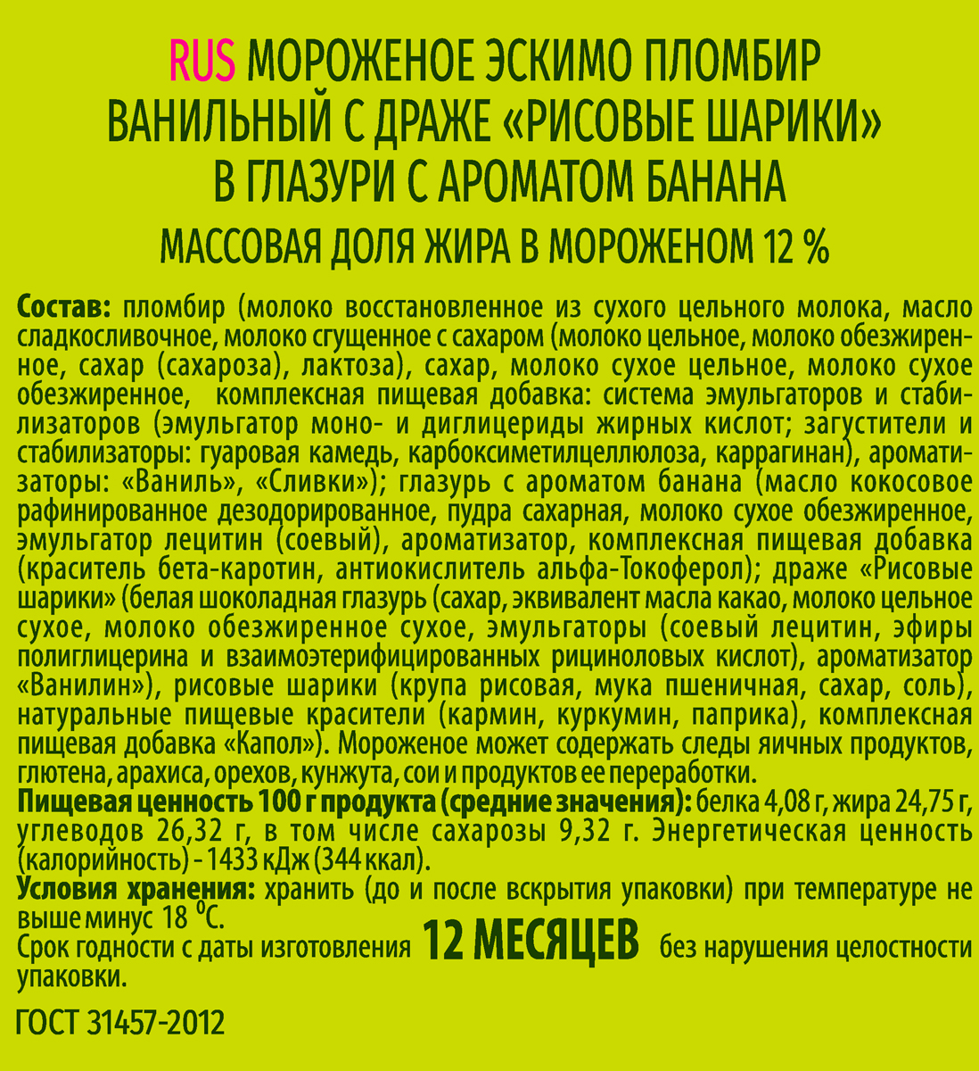 Нежное, тающее во рту эскимо, окутанное банановой глазурью, скрывает внутри себя хрустящие рисовые шарики с необычными вкусами! Кремовый пломбир, яркая банановая нотка и неожиданный хруст... Апельсиновый? Малиновый? Манго? Угадайте, какой вкус вас ждёт!