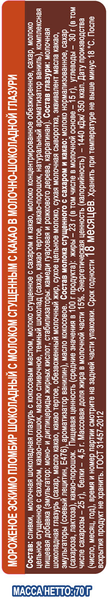 Очень вкусное, супер шоколадное! Кто любит шоколадное точно оценят. Пломбир вкусный, глазурь тонкая, хрустящая,не жирная, внутри вкусная начинка из сгущёнки с какао. Состав хороший