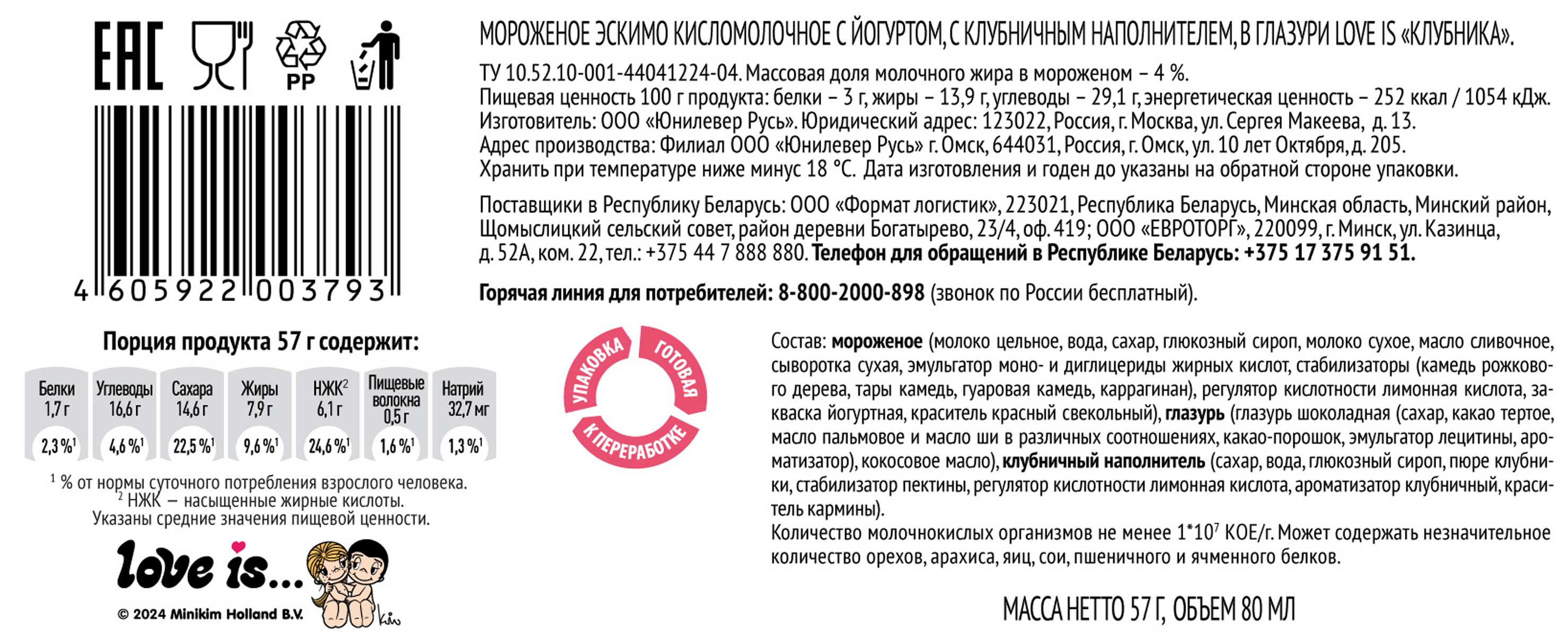 «Инмарко» совместно с брендом Love Is создали мороженое, которое стало не просто вкусным лакомством, а целой историей любви, наполненной яркими эмоциями. Нежная йогуртовая основа в сочетании с клубникой и хрустящей глазурью создают настоящую феерию вкуса. А что значит любовь для вас? Откройте для себя десерт, который заставляет сердце биться чаще и соберите всю коллекцию дизайнов Love Is...