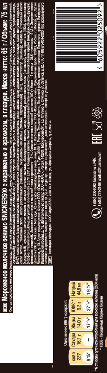 Snickers Ice Cream эскимо — это не только сытный перекус, но и настоящее удовольствие. Свежее сливочное мороженое с карамелью, покрытое глазурью из молочного шоколада и обжаренным хрустящим арахисом. Это все, что нужно для нескольких минут счастья, которые стоит посвятить только себе!