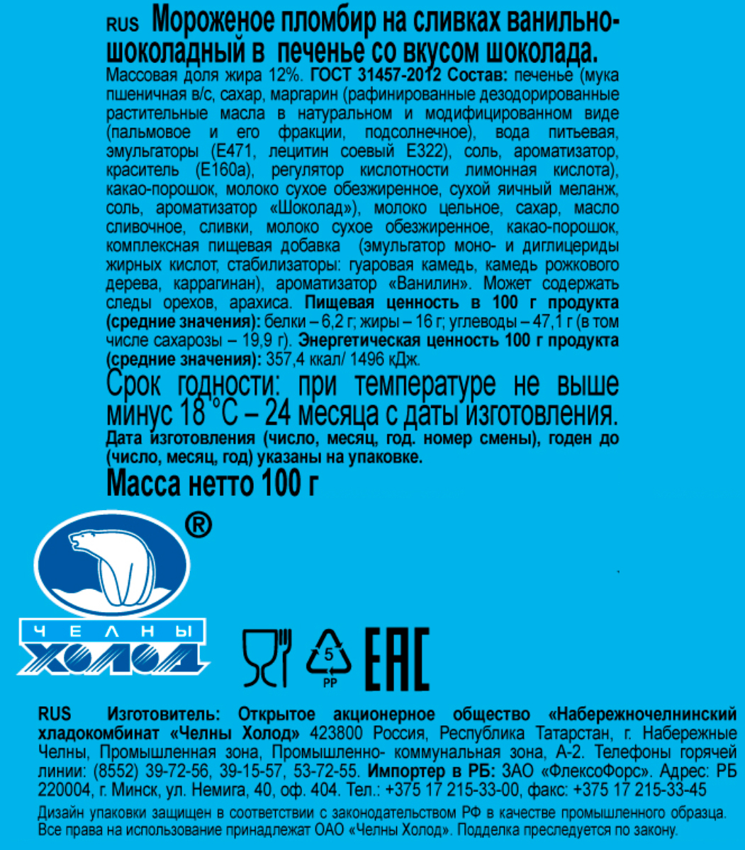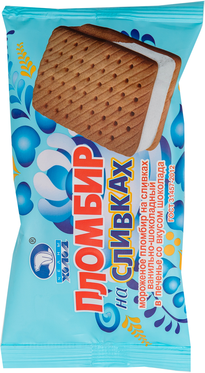 Пломбир на сливках изготовлен только из натуральных ингредиентов. Брикет состоит из двух толстых слоёв вкуснейшего сахарного печенья со вкусом шоколада, между которыми находится нежный пломбир, приготовленный из свежайших сливок, разделяющийся пополам на ванильный и шоколадный вкусы. Не содержит в составе воду и заменители молочного жира. Этот сладкий сэндвич хорошо охлаждает и является идеальным сытным перекусом летом в жару!