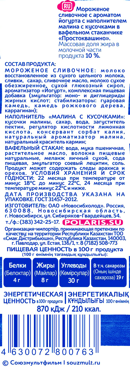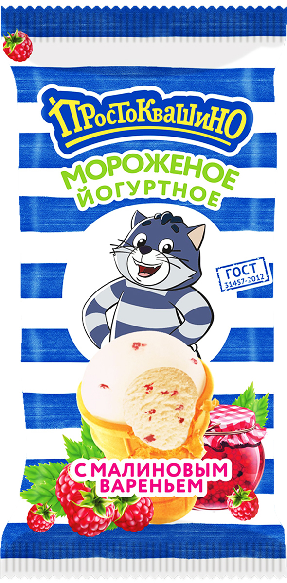 Йогуртное мороженое «Простоквашино» с малиной в вафельном стаканчике — это нежное сливочное мороженое с освежающей кислинкой йогурта и сладостью малинового варенья. Внутри упаковки вас ждет дополнительный сюрприз в виде наклейки с любимыми мультигероями. Жирность — 10%.