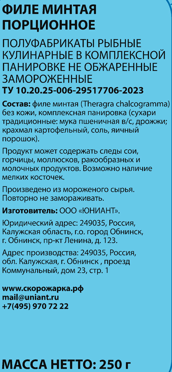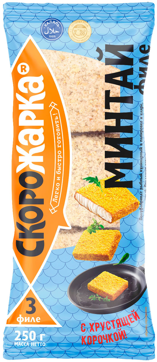 Нежное и сочное тщательно отбранное филе минтая «Скорожарка» идеально подходит для жарки на сковороде. Аппетитное блюдо с золотистой корочкой и мягкой текстурой внутри — у вас на кухне! В минтае содержатся витамины группы В, PP, а также А и С. Из минералов больше всего содержится фтора, калия, кальция и фосфора. Благодаря такому составу минтай считается очень полезной рыбой.