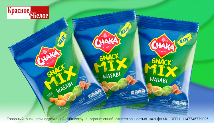Ого, вот это да! В наших магазинах появилась необычная новинка для любителей острых вкусов. Снэки Chaka Mix Wasabi — это головокружительное комбо из жареного арахиса, печеных зерен кукурузы и хрустящих чаксов. Отборный арахис обжарен до золотистого цвета, а часть ядрышек покрыта аппетитной хрустящей корочкой со вкусом обжигающего васаби. Ну где вы такое пробовали? А еще в этом пакетике есть спелые зерна кукурузы, запеченные со специями до смачного хруста, и ароматные воздушные чаксы из кукурузно-ржаной муки со взрывным вкусом острой приправы. Сочетай разные хрусты, пробуй актуальные вкусы, создавай множество крутых комбинаций — миксуй ощущения под настроение!